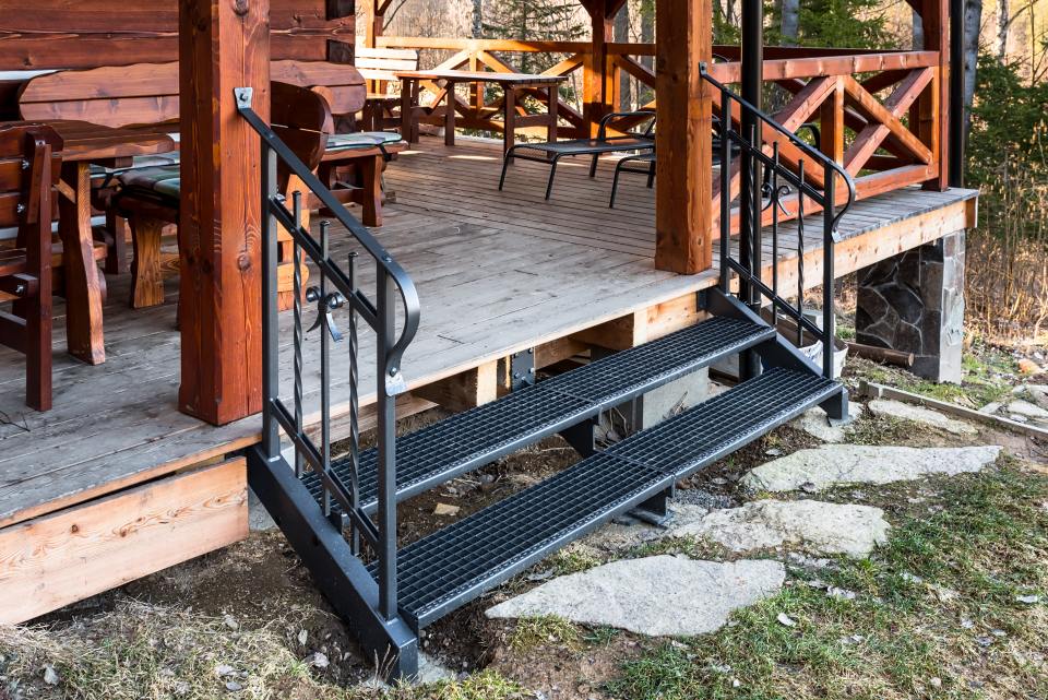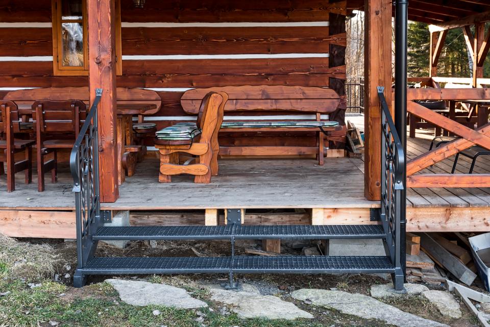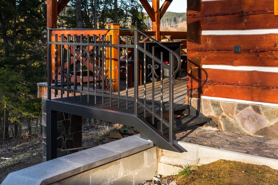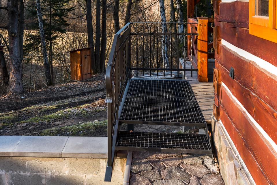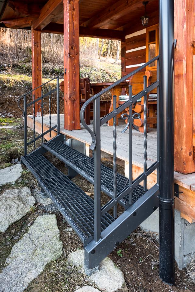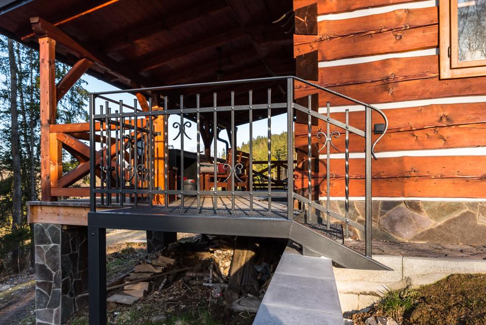 Kované schodiště s podestou z pororoštu u terasy roubenky. Pororošt by zvolen z praktických důvodů, aby se nečistoty na botách nedostávaly na podlahu podesty. Nalakováním pororoštu do stejné barvy jako zábradlí došlo ke vzájemné harmonii.